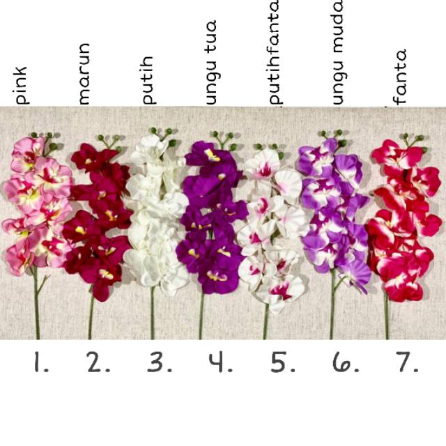 Anggrek palsu, bukan asli.toko saya hanya jual tanaman artificial alias buatan.Harga 1 tangkaiT keseluruhan ±80cmT bunga nya ±40cmDiameter tiap bunga sekitar 12cmlihat fotobahan kain bukan latex.tidak jual anggrek bahan latex (karena mahal sis, jadi gak nyetok anggrek latex sayamah