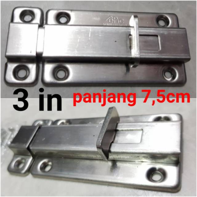 slot lebar stainless 3in = 7,5cmberbahan stainless tebal anti karatsudah dilengkapi sekrup.Bisa untuk pintu utama, kamar, kamar mandi, dan lainny